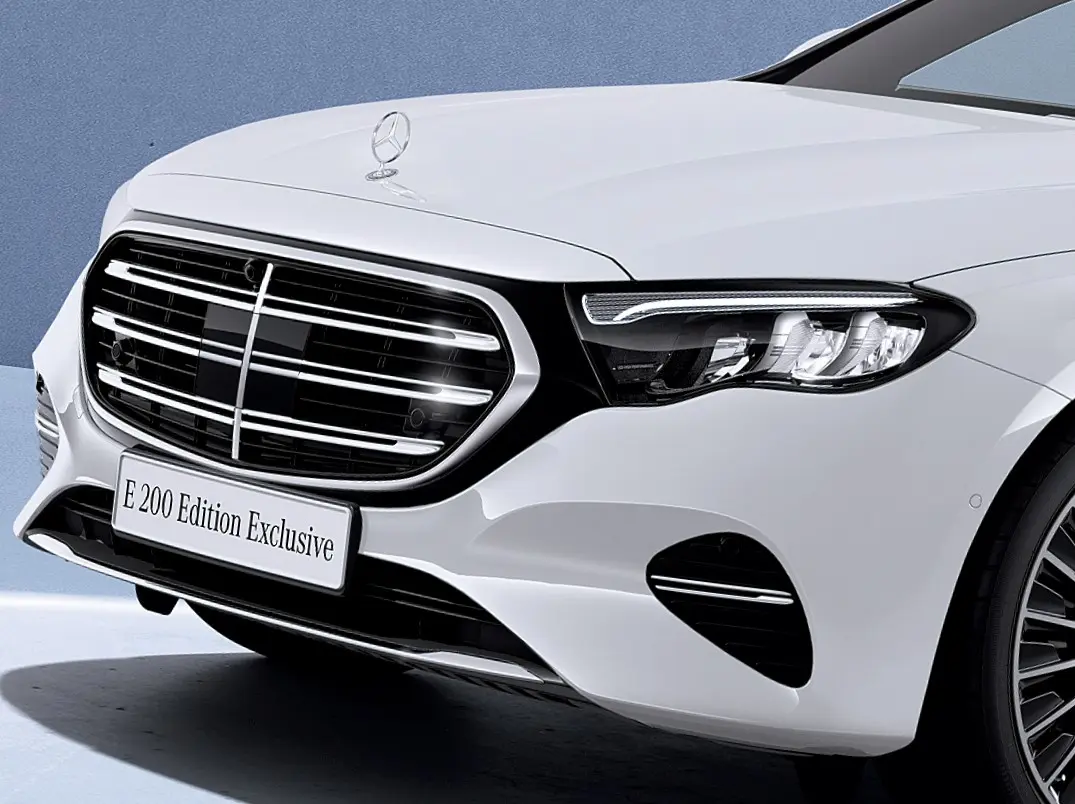 エクステリアデザインは、通常E 200に設定のないエクスクルーシブラインを採用しました。メルセデス・ベンツの伝統的なフロントフェイスを象徴するスリーポインテッドスターのボンネットマスコットや、3 本の水平ダブルルーバーを備えたラジエターグリルが、よりエクスクルーシブな雰囲気を演出します。また、E 200 では有償オプションのパノラミックスライディングルーフおよび、20インチAMGアルミホイールを標準装備として採用しています。