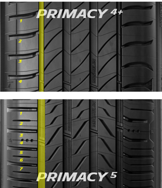 WET性能に効くトレッドパターンで、ショルダー部の縦溝の幅を広げて排水性能を向上させました。また太い横溝と細い横溝を組み合わせることでブロックのエッジの数を増加させ、これにより静粛性を損なわずに排水性能・エッジ効果を向上。PRIMACY 4+に比べ、新品時及び摩耗した状態のどちらにおいても溝の体積が10%以上増加。濡れた路面での性能に貢献し、摩耗した状態でも安心感が長く続きます。