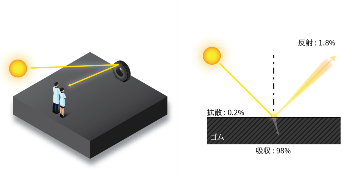 タイヤのサイドウォールデザインは、光がタイヤ表面で反射をし、目に届くことで可視化されます。反射量が多いと白く見え、反射量が少ないと黒く見えます。