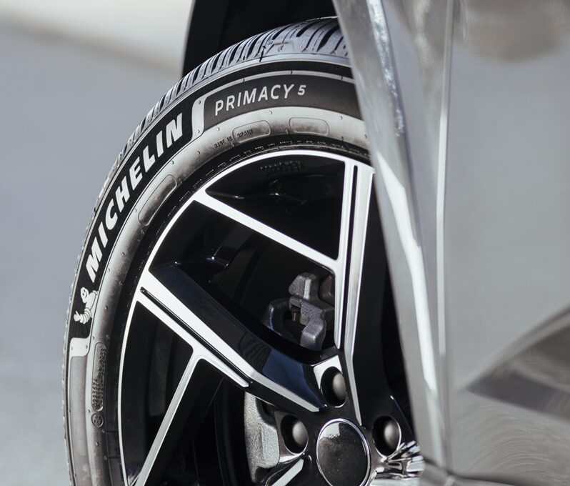 静粛性に優れ、上質で快適な乗り心地を提供するプレミアムコンフォートタイヤ「MICHELIN PRIMACY 5」は、MICHELIN PRIMACY4+ とMICHELIN PRIMACY SUV+の後継となる製品で、コンパクトカー、セダン、ミニバン、SUVと幅広い車種に対応します。滑らかな乗り心地と高速走行時の安定したハンドリング性能を実現し、雨天時の優れたウェットブレーキング性能が長く続くことで、ドライバーへ「長く続く安心感」を提供します。このようにドライバーのあらゆる性能に対する高い要求に応えることができました。さらにタイヤのサイドウォールデザインに上質な黒とベルベットを思わせる高級感のある手触りを実現したことから、車を足元から引き立てます。(18インチ以上に適用)