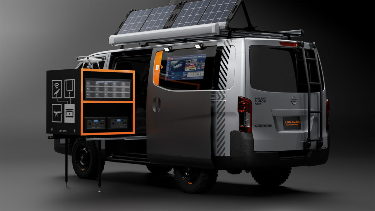 オートサロンに出展する「キャラバン」のカスタムカー第5弾として、災害時に備える支援車両を提案します。今年1月に出品した「Disaster Support Mobile-Hub」にいただいたお客さまからの声を元に、実用を見据えて進化しました。発売中の「ポータブルバッテリー from LEAF」を随所に配置し、実用的な機能を充実。日常使いに加え、有事の際に数日間、災害支援活動することを想定しています。(参考出品)