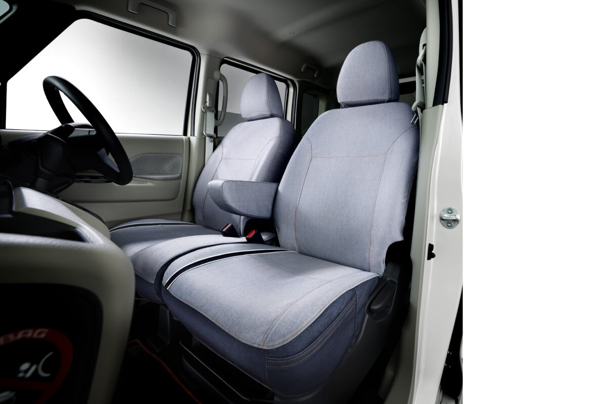 • 裏返したデニムを再現したシートカバーを全モデルに採用しました。ビンテージデニムの特徴である、通称“赤耳”と呼ばれるほつれ止めをあしらったアクセントを座面に入れ、ビームスのピスネーム(タグ)や、大小のシートポケットなど、ジーンズのデザインをインテリアに落とし込んでいます。