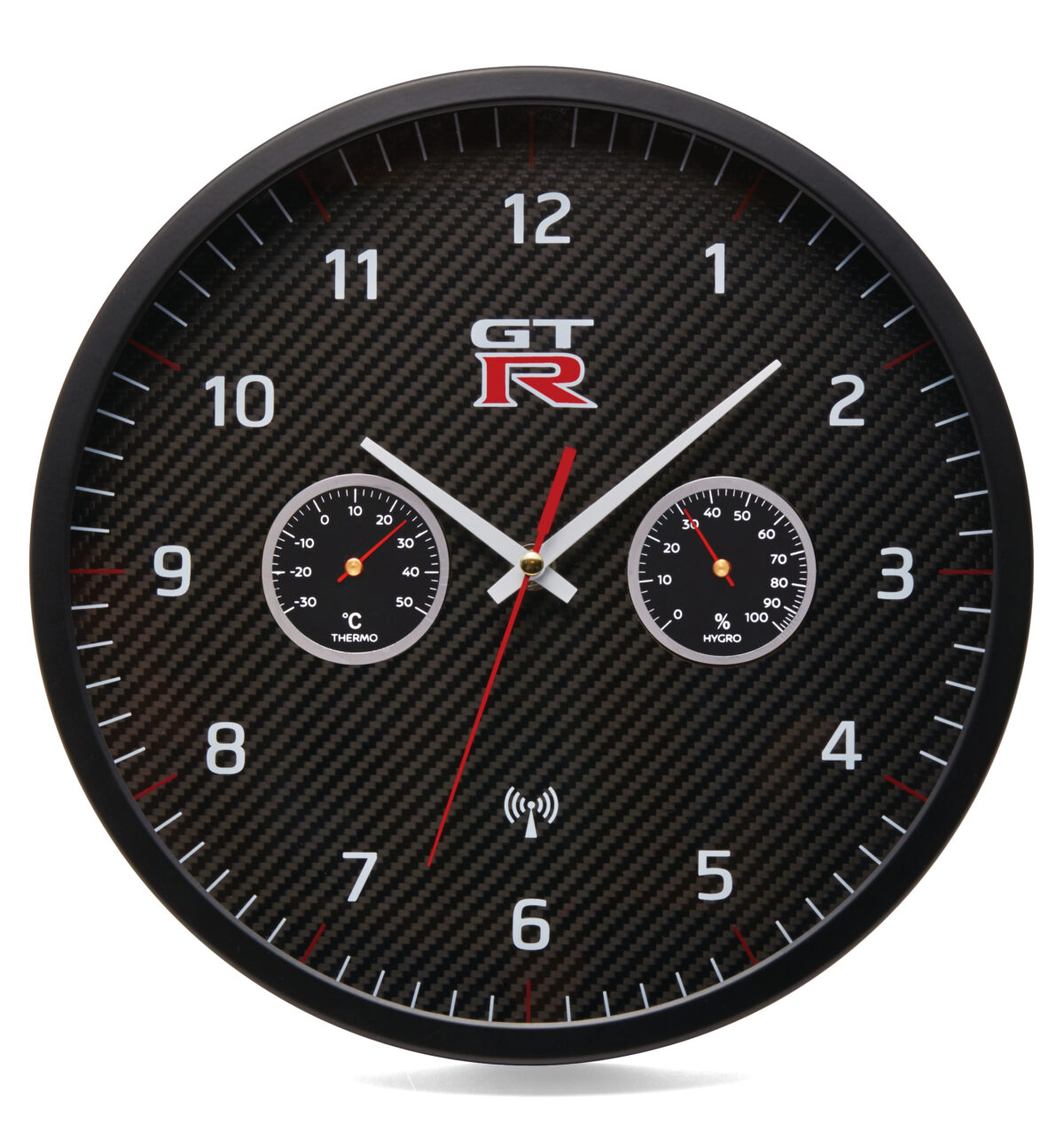 リアルカーボンの文字盤に GT-Rロゴを配した電波受信式の壁掛け時計です。温度計と湿度計を組み込み、高性能とスタイリッシュさを兼ね備えたアイテムです。