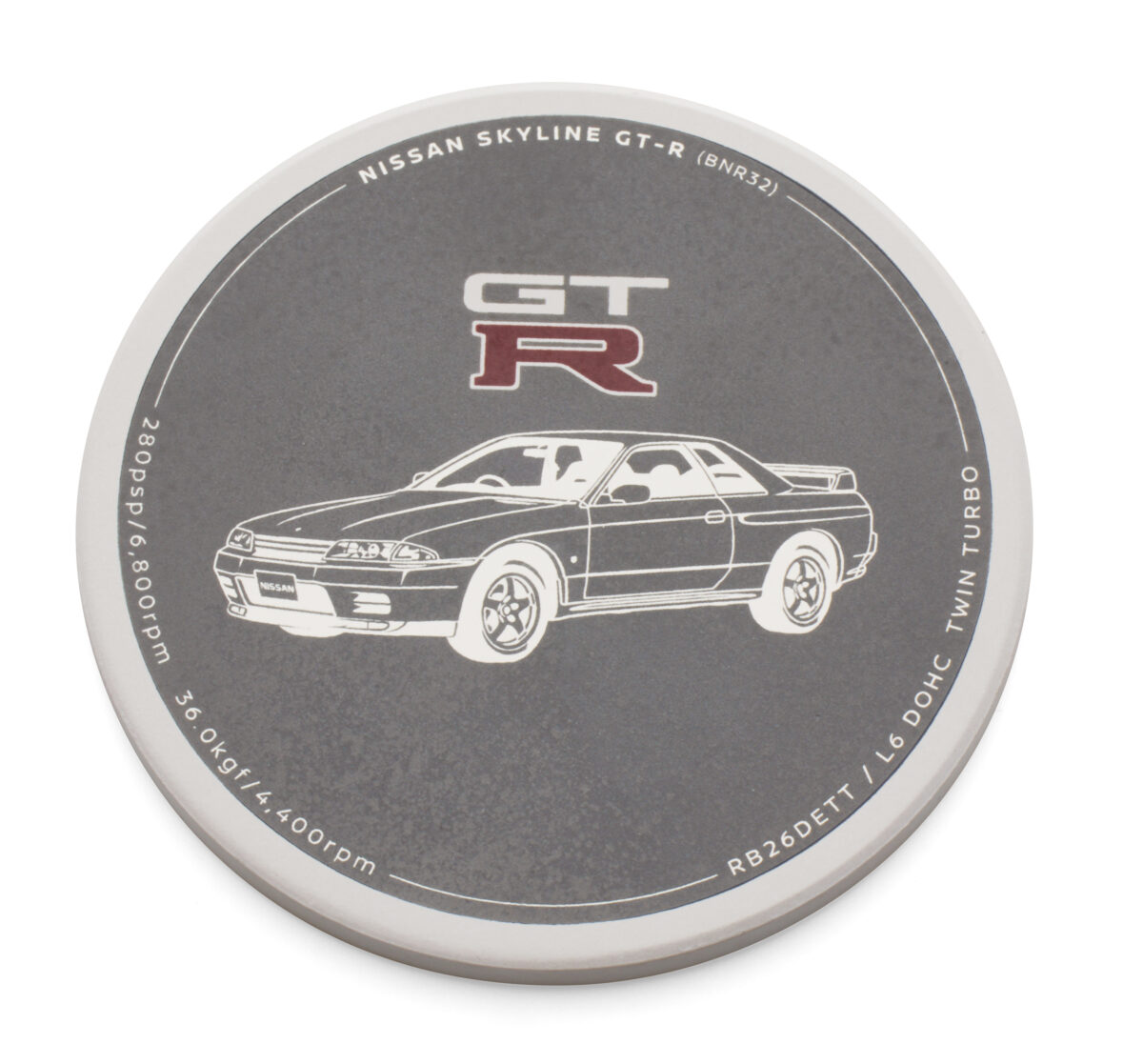 日産自動車デザイン部のデザイナー描き下ろしイラストシリーズに、スカイラインGT-Rのイラストを配した白雲石コースターが仲間入りしました。吸水性に優れ、水滴でデスクが濡れることを防ぎます。R32型、R33型、R34型の3種類を設定しました。
