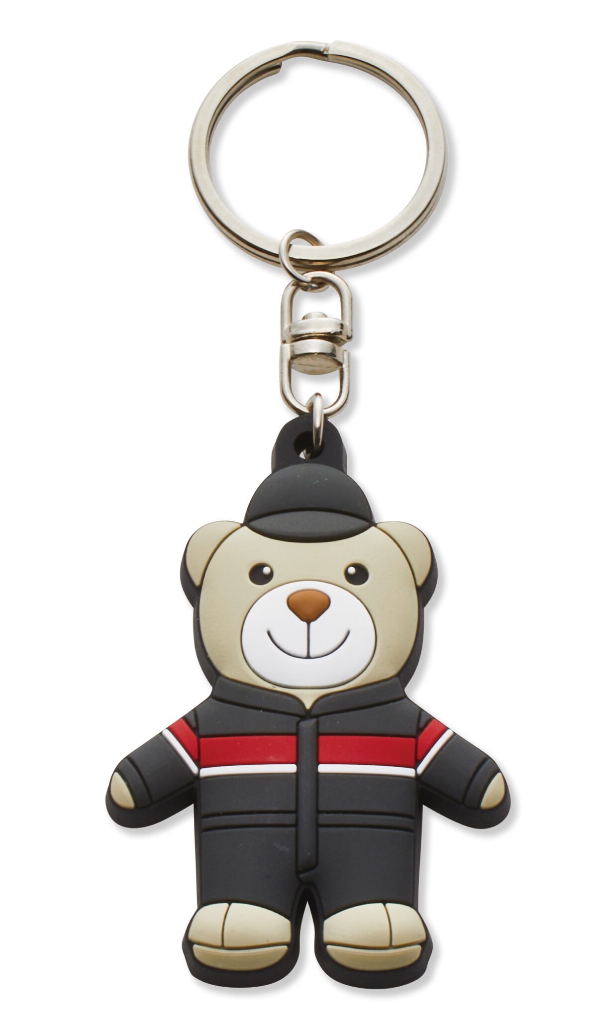 メカニックのユニフォームを着たベアマスコットのラバーキーホルダーです。