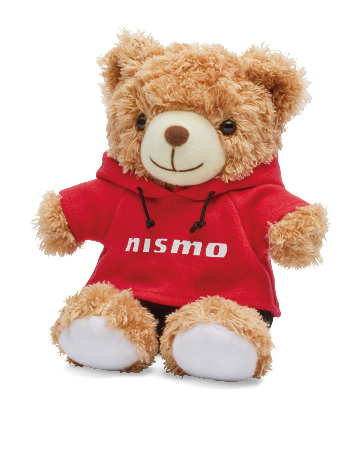 スポーティな赤いパーカーを着用したNISMOベアです。フードをかぶせたスタイルも楽しめます。