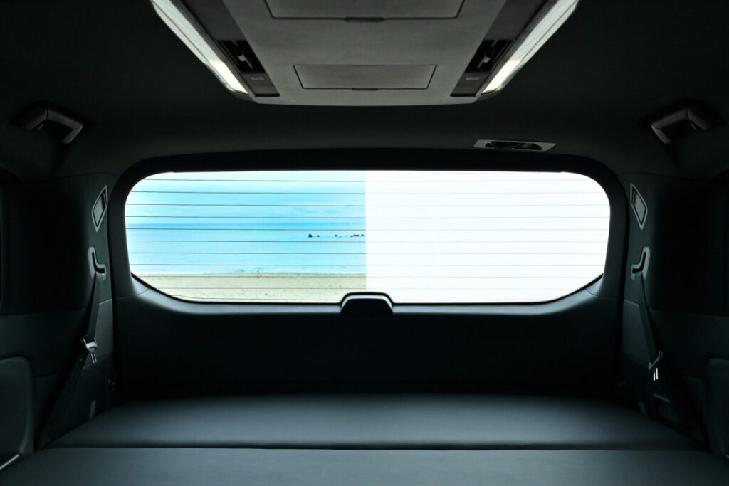 ハイエースハイメディック(救急⾞)、⽇産セレナ等にも採⽤されている「SEIKO ELECTRIC調光フィルムSILF」をリアウィンドウガラスに施⼯。これまで、⾞外からの視線をコントロールする⽅法はスモークフィルムの貼り付けや⾞内へのカーテン設置が⼀般的な⽅法でしたが「エレクロトニックシェード」はワンタッチ(リモコンON/OFFで透過・遮蔽を切り替えられる)でウインドウガラスを遮蔽する業界で初めての後付け可能な製品を、後席⽤パワーサイドサンシェード(スライドドアガラス・リヤクォーターガラス)の設定が無いバックドアガラスに施⼯しました。