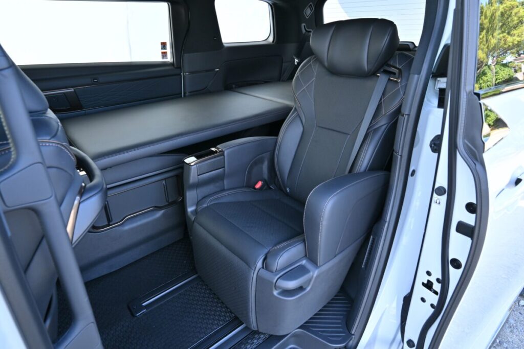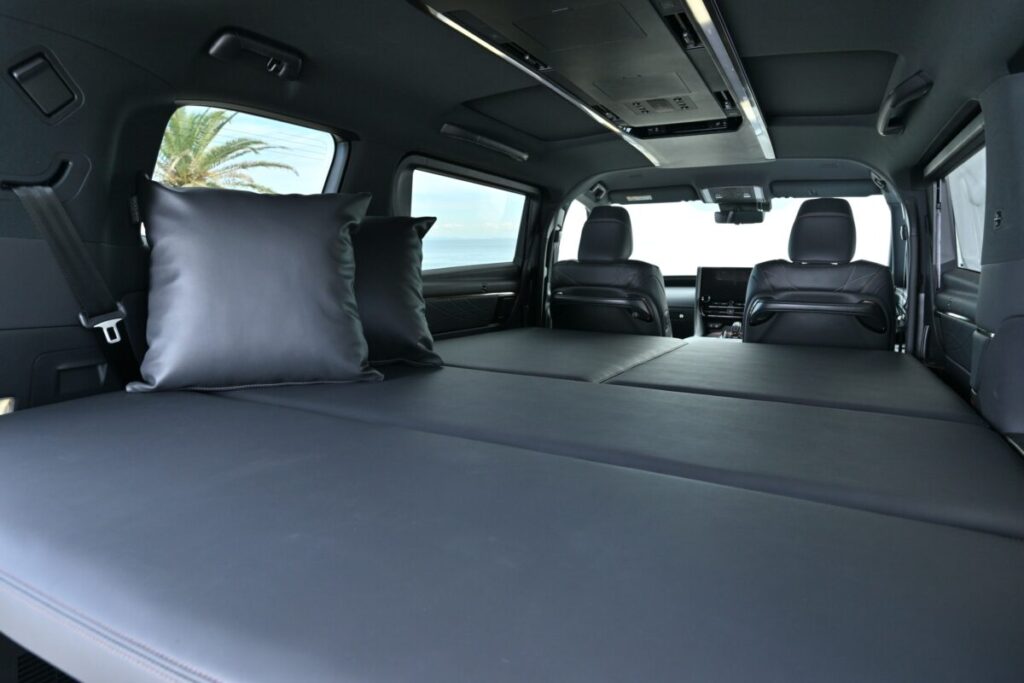 ベッドマットは最大全長210cm(最大幅約140cm)のベッド展開を可能にし、マット表皮はベルファイア・アルファードの上質なインテリアに沿った専用レザーをダブルステッチで仕上げています。