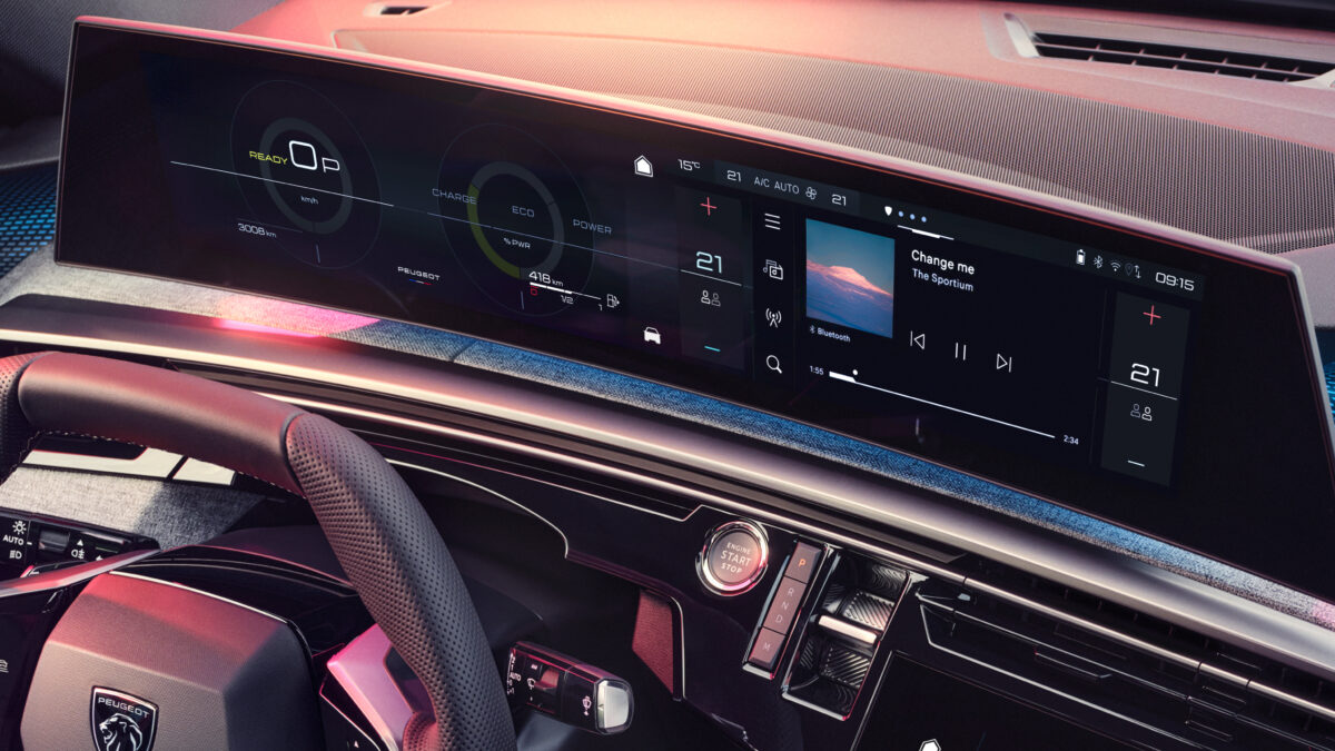 新開発の「PEUGEOT Panoramic i-Cockpit(プジョー パノラミック アイコックピット)」を採用。21インチのパノラミックスクリーンがi-Cockpitと融合し、未来的なフローティングデザインを実現しています。機能においても、スクリーン表面がドライバーに向けてゆるやかにカーブすることにより、必要な情報を集約すると同時に、視認性と操作性が向上しています。