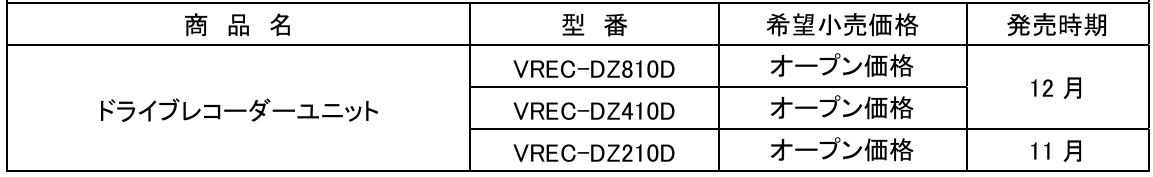 ※2 「VREC-DZ810D/-DZ410D」は、別売の駐車監視ユニット「RD-DR002」(2,970円/税込)を取り付けることで最大24時間365日、「VREC-DZ210D」は、別売の駐車監視ユニット「RD-DR001」(6,600円/税込)を取り付けることで最大12時間の駐車監視が可能です。