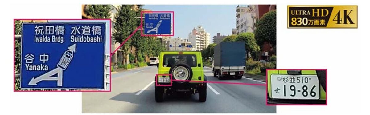 一般的なフルHD(約200万画素)と比べ、約4倍(約820万画素)の高解像度4K録画に対応。ナンバープレートや看板の文字、周辺の状況に至るまで、高画質で鮮明な映像記録が可能です。