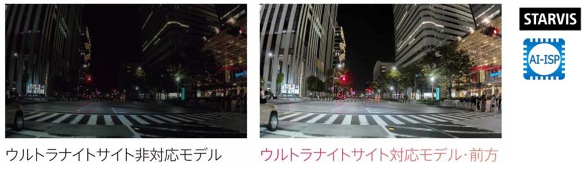 フロントカメラは、高感度・高画質を実現するSONY製CMOSセンサー 「STARVIS™」と当社独自の画像認識・処理の知見を活かした「AI-ISP(Image Signal Processor)」を組み合わせた「ウルトラナイトサイト」に対応。独自の機械学習アルゴリズムで運転シーンやノイズ特性に合わせた画像チューニングを行い、夜間の走行や暗闇の駐車場でもコントラスト豊かなメリハリのある映像を記録できます。また、リアカメラは高感度録画「ナイトサイト」に対応。