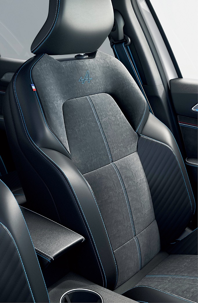 レザーフリーとなりTEPレザーが使用されたインテリアも、スポーツシックなデザインで統一されています。フロントシートには、アルピーヌロゴとブルーステッチがあしらわれ、ステアリングホイールとドアパネルにはトリコロールのステッチが施されています。