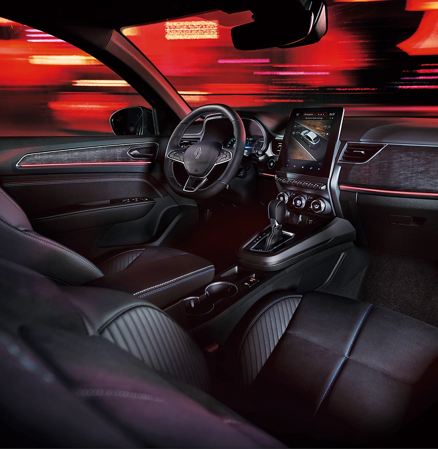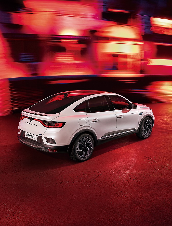 ロントエンドに装着されたフラットデザインの新しいエンブレムと、ハーフダイヤモンドシェイプが立体的に浮かび上がる斬新なフロントグリルの組合せが、新型ルノー アルカナにエレガントで奥行きのある表情を与えています。ブラックルーフから続くリアエンドは、新エンブレム、ブラック「ARKANA」ロゴ、ブラックエキゾーストフィニッシャー、クリアライトクラスターによってスポーティな印象を高め、19インチとなった専用デザインの大径ホイールでさらに強調されています。