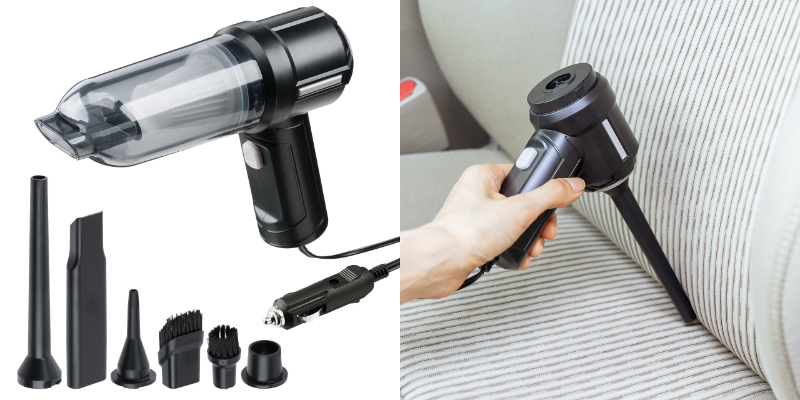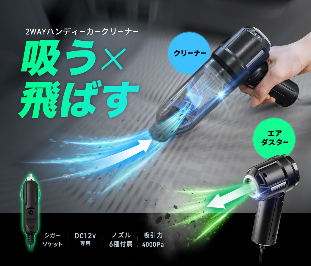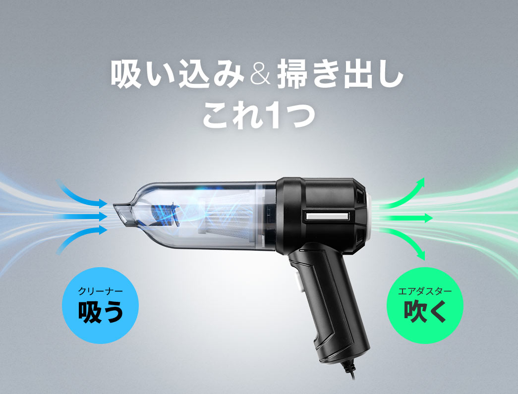 このハンディカークリーナーは、掃除機としての機能に加え、電動エアダスターとしても使用可能です。車内の細かいゴミやほこりを吸引するだけでなく、エアダスター機能で隙間にたまったゴミを吹き飛ばすこともでき、これ一台で車内の清掃が完結します。