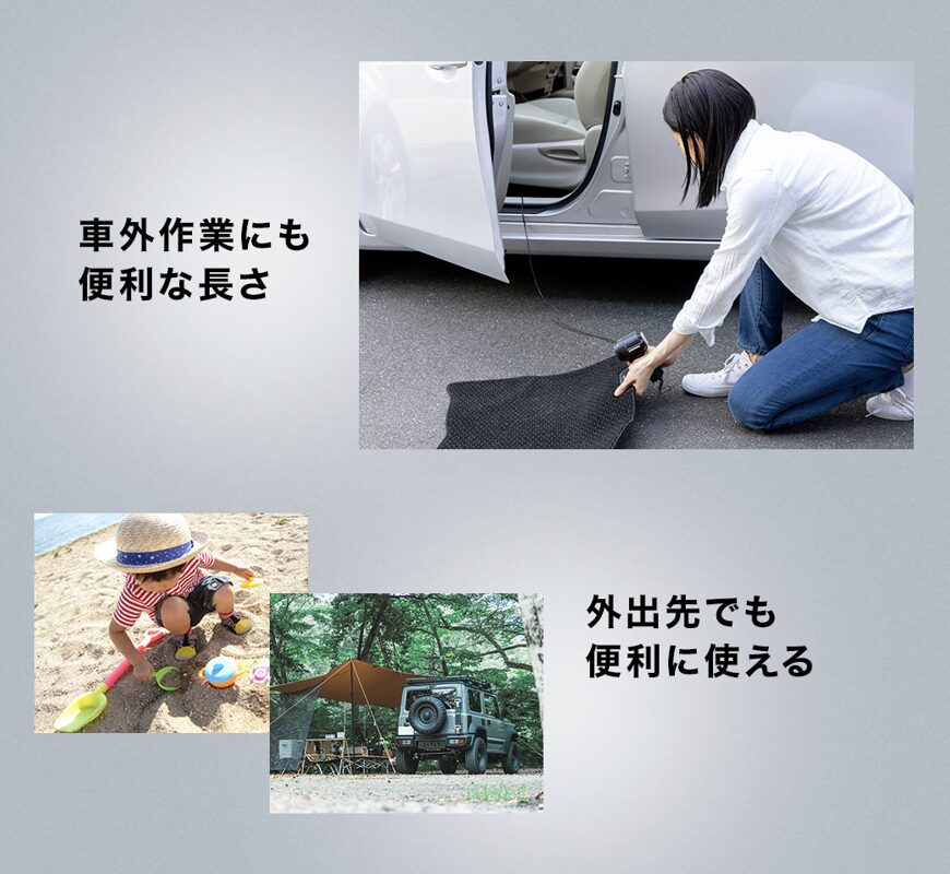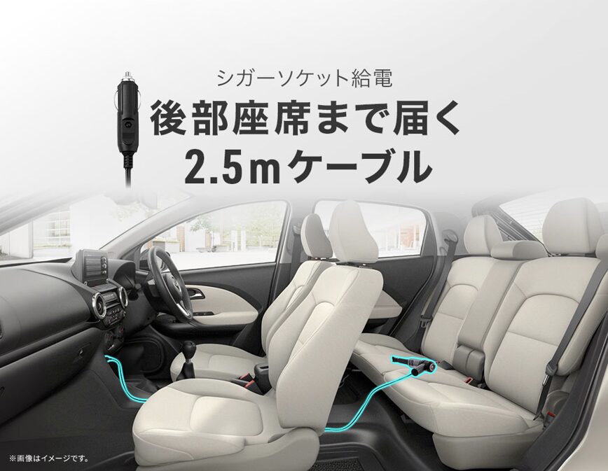 コードの長さは2.5mあり、前席だけでなく後部座席までしっかり届きます。また、車の中にバッテリー付きの製品を保管すると発熱や発火の可能性があるため、