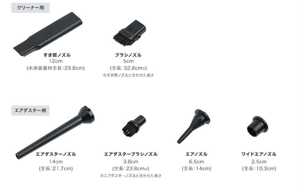 付属のアタッチメントには、すき間ノズルやブラシノズル、エアダスターノズルなど多彩な種類が揃っています。これにより、車内のさまざまな場所に対応でき、効率的に掃除が行えます。自分のスタイルに合わせた使い方が可能です