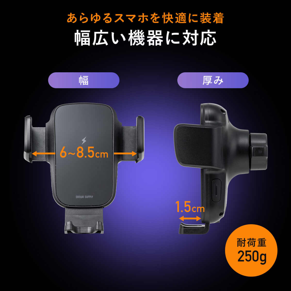 幅6~8.5cm、厚さ1.5cm以下、重量250g以下のスマホに対応。カバーをつけても問題ありません。