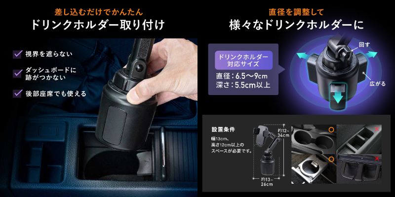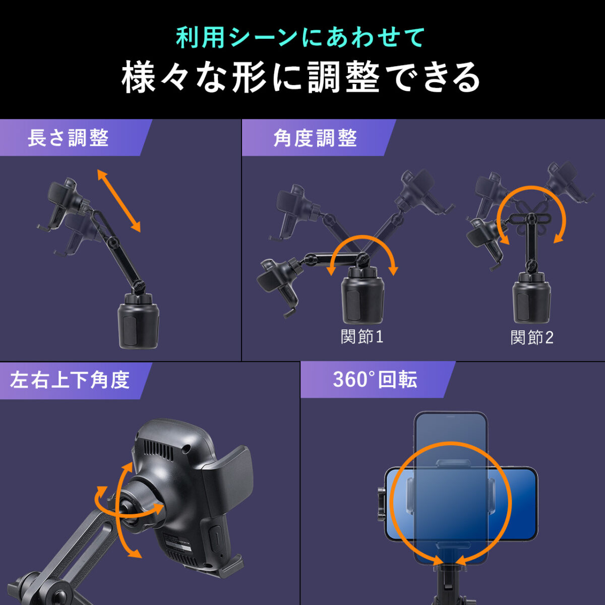 200-CAR099は、ドリンクホルダー固定タイプで、2箇所の関節で角度の調節が可能です。