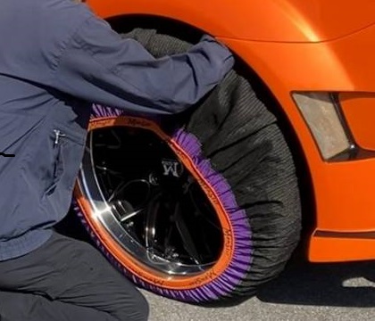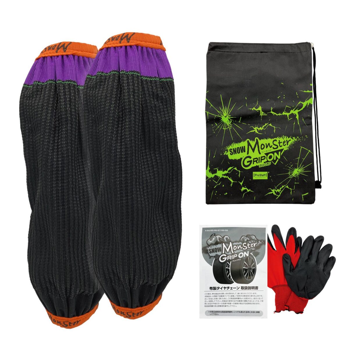 スタッドレスタイヤを履いていない車が氷雪路を走行する際、金属製チェーンを装着することが一般的ですが、取り付けに経験や時間を要すことが課題のひとつとなっています。「スノーモンスターグリップオン」は、装着が3分で出来るほど簡単でありながら、強力なグリップを発揮する布製タイヤチェーンです。