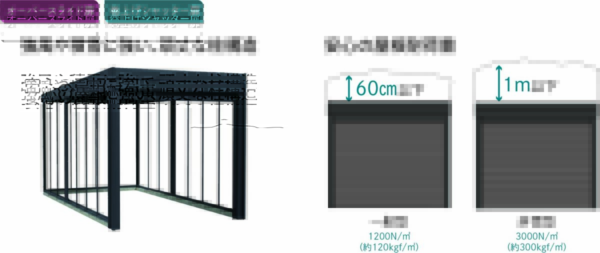 | 屋根耐荷重 | 一般型:1200N/m² (約120kgf/m²)多雪型:3000N/m² (約300kgf/m²) |