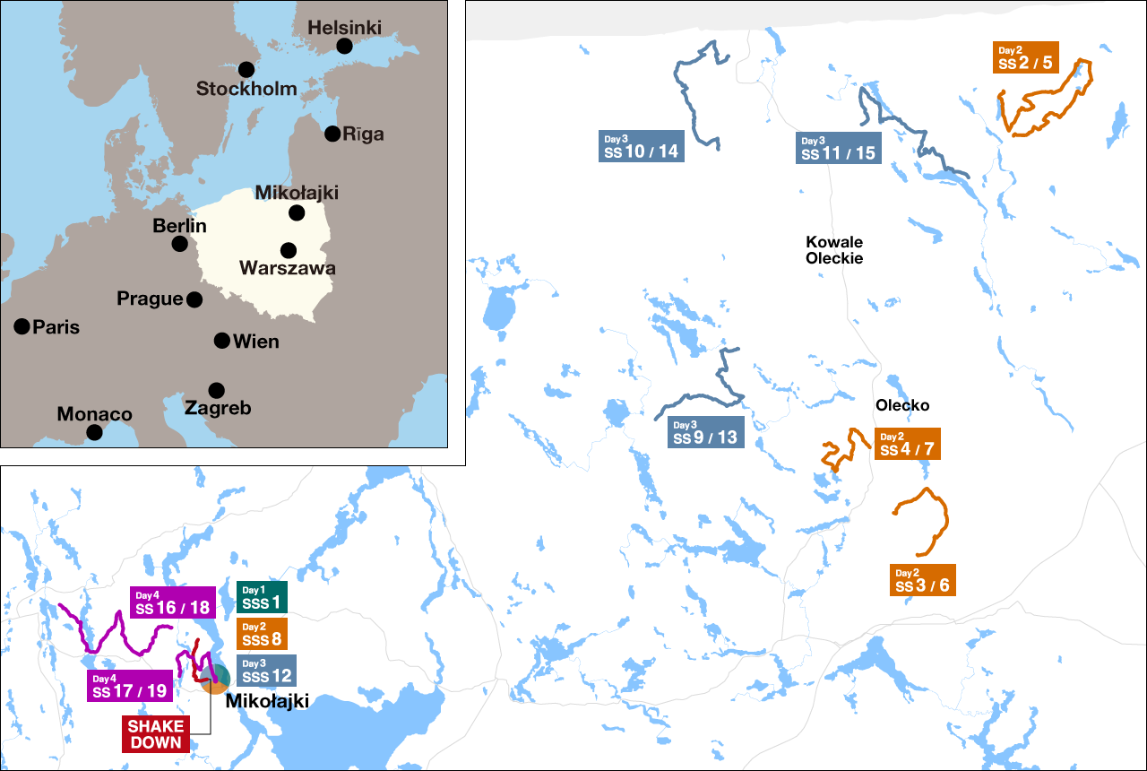 ラリーは27日(木)の夕方にセレモニアルスタートが行われ、19時過ぎから競技がスタート。サービスパークのすぐ近くでスーパーSSが1本行われます。本格的な戦いは28日(金)の朝から始まり、デイ2として3本のステージを「タイヤフィッティングゾーン」でのタイヤ交換および簡易的な整備作業を挟んで各2回走行。一日の最後にはSS1と同じコースでスーパーSSが行われます。29日(土)のデイ3は、3本のステージをミコワイキでのスーパーSSおよびミッドデイサービスを挟んで各2回走行。7本のステージの合計距離は124.10kmと、4日間で最長の一日になります。最終日のデイ4は、2本のステージを各2回走行。そのうち、SS17の再走ステージとなるSS19「ミコワイキ2」は、トップ5タイムを記録した選手とマニュファクチャラーに、ボーナスの選手権ポイントが与えられる「パワーステージ」に指定されています。19本のステージの合計距離は303.16km、リエゾン(移動区間)も含めた総走行距離は1375.64kmが予定されています。