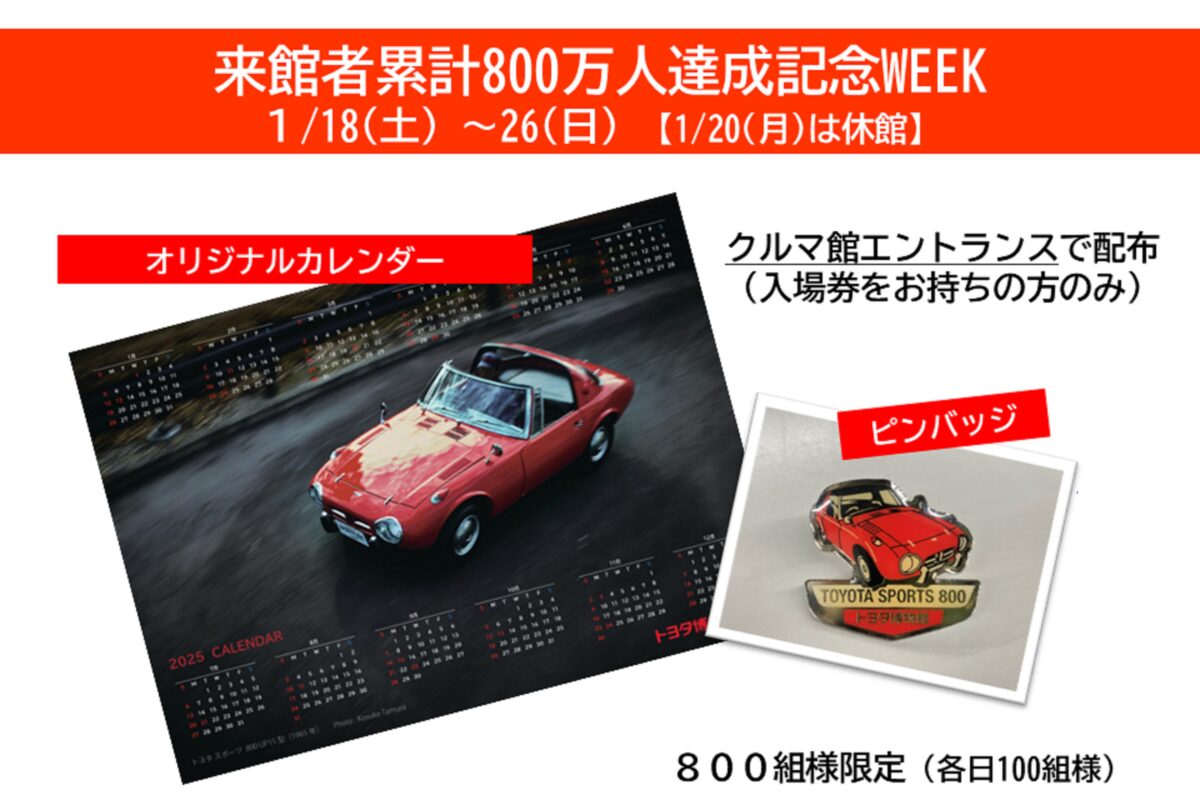 みなさまへの感謝の気持ちを込めて1月18日(土)~1月26日(日)(1/20(月)は休館)に「800万人達成記念WEEK」を開催。各日先着100組限定でオリジナルグッズを プレゼントします。「800」にちなんで、クルマ館エントランスに“トヨタスポーツ800”と“ホンダS800”を展示しています。