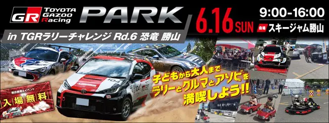スキージャム勝山は、2024年6月16日(日)に「TOYOTA GAZOO Racing PARK in TGRラリーチャレンジ Rd.6 恐竜 勝山」を開催すると発表した。