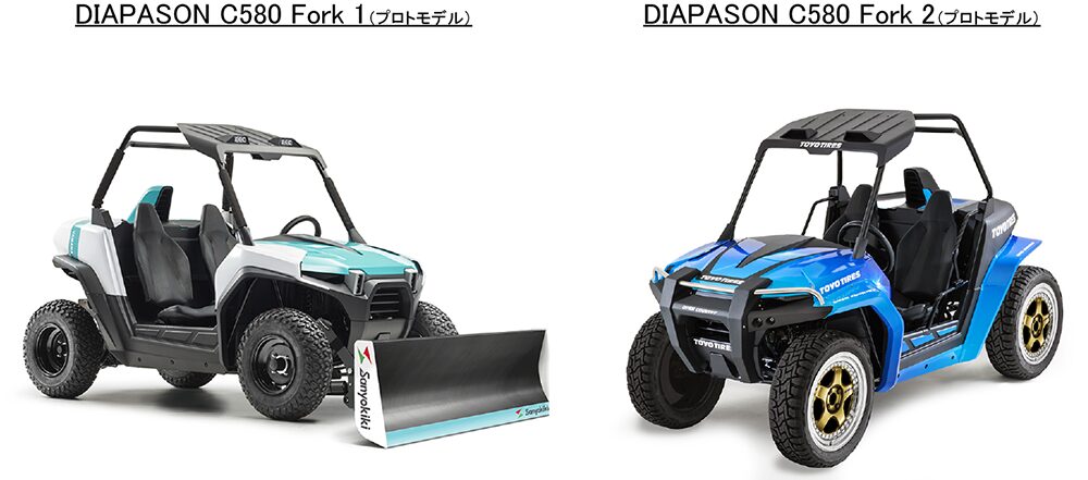 「DIAPASON C580 Fork 1」では、農業機械分野で実績を持つ三陽機器株式会社や、自動車チューニングで定評のある株式会社尾林ファクトリーをはじめとするパートナーと連携。軽量コンパクトなボディにドーザーやトレーラーなどを装備し、高い機能性を実現したモビリティを提案します。一方、「DIAPASON C580 Fork 2」は、SUV/ピックアップトラック向けタイヤ「OPEN COUNTRY(オープンカントリー)」シリーズで定評のあるTOYO TIRE株式会社のコーポレートカラーである青を基調にした「オープンカントリーオフロード仕様」として、自動車以外の領域におけるカスタマイズ文化の新たな可能性を提示し、次世代のモビリティデザインを牽引します。
