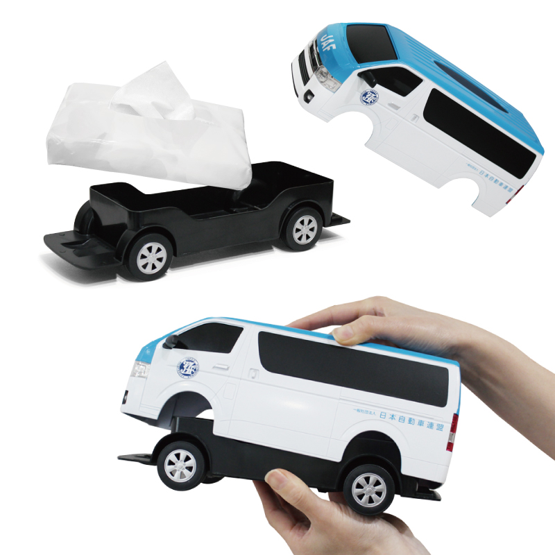 ノリモノの形の雑貨を企画する株式会社フェイスから、JAF (日本自動車連盟)の車両を再現したティッシュケースがノベルティつきで販売を開始しました。