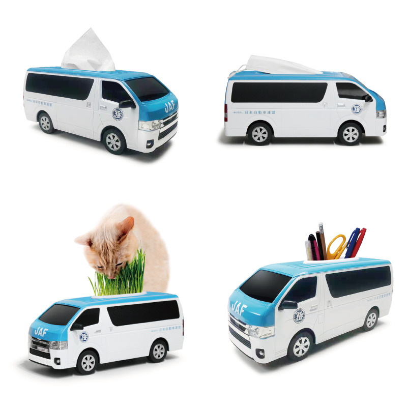 株式会社フェイスは、JAF (日本自動車連盟)の車両を再現したノベルティ付きJAFティッシュケースの販売を開始した。ミニカーそのものの見た目ながら、ペン立てや小物入れなどマルチに使えるアイテムだ。生産数1000台の数量限定商品となっており、価格は4,950円(税込)である。