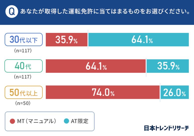 30代以下は「AT限定」のほうが多く、40代、50代以上では「MT」のほうが多い結果になった。