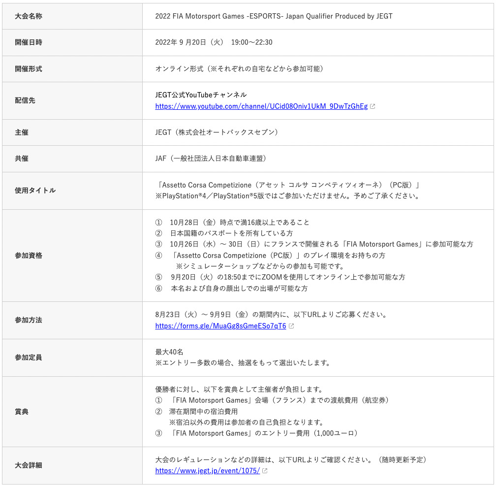 株式会社オートバックスセブン(代表取締役 社長執行役員:堀井勇吾)(以下、当社)が主催するeモータースポーツ大会「JEGT」は、JAF(一般社団法人日本自動車連盟)と共催し、10月26日(水)~30日(日)にかけてフランス・マルセイユで開催されるFIA(国際自動車連盟)による自動車競技の国際大会「FIA Motorsport Games」のeスポーツ部門の日本代表選手選抜大会「2022 FIA Motorsport Games -ESPORTS- Japan Qualifier Produced by JEGT(以下、FIA MG 日本代表選考会)」を9月20日(火)に開催いたします。