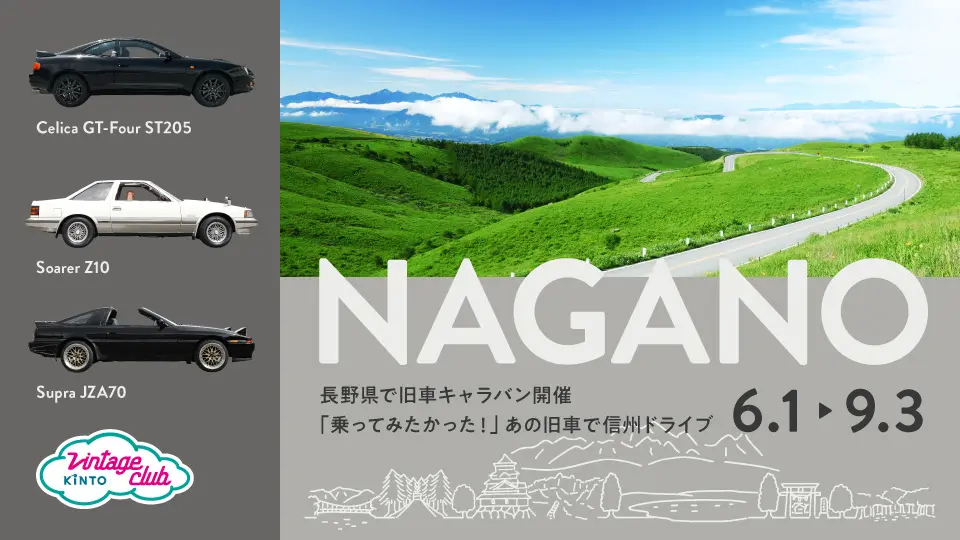 株式会社KINTOは、同社が運営する旧車コミュニティ「Vintage Club by KINTO」で行っているイベント「旧車キャラバン」の第4弾を長野県で実施することを決定した。長野トヨタ自動車株式会社とともに、同社が開催するこのイベントは、2023年6月1日~2023年9月3日の期間中、旧車をレンタルして美しい自然やレトロな街並みが広がる長野をドライブすることができる。さらに、GT-FOUR3世代の最後を飾った完成形「セリカGT-FOUR ST205」がラインナップに追加され、長野キャラバンをより盛り上げることだろう。