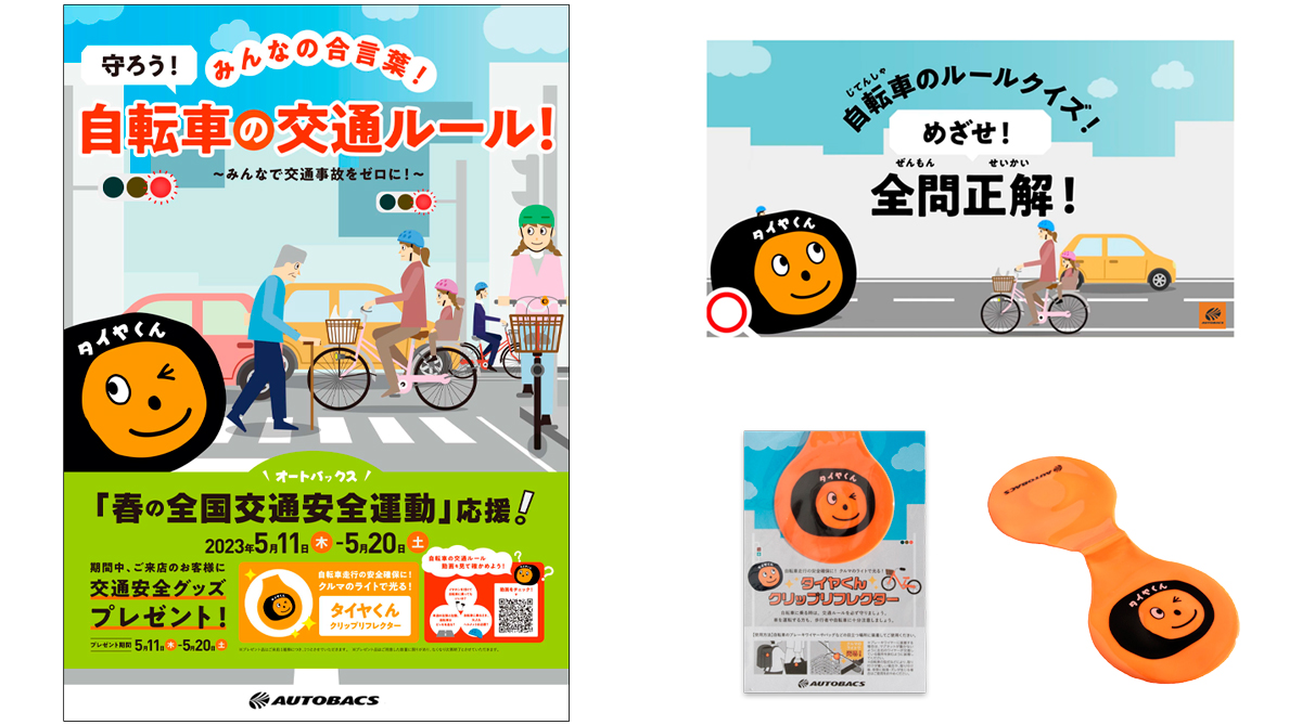 株式会社オートバックスセブンは、令和5年春の全国交通安全運動に合わせ、5月11日(木)~5月20日(土)の期間中、全国のオートバックスグループ店舗(一部店舗を除く)において、「自転車のヘルメット着用と交通ルール遵守の徹底」を啓蒙する活動を実施すると発表した。期間中、来店したユーザーには、子どもを中心にクリップリフレクターを無料で配布する。また、子どもにもわかりやすいクイズ形式の動画「自転車の交通ルール」を公開中だ。