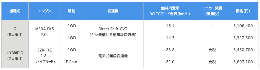 グレード構成は7人乗りのHYBRID Gと8人乗りのGの2種類を設定しました。