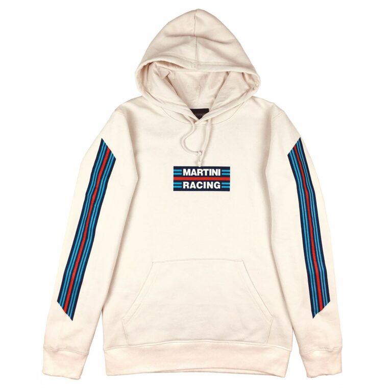 薄手のコットン/ポリエステル生地を採用した、マルティニ・レーシング オフィシャルの裏起毛フードパーカー。