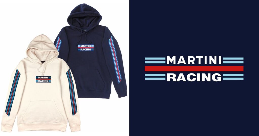 パーカーの中央にマルティニ・レーシングのロゴと、袖の一部分に平行四辺形型のマルティニ・ストライプがあしらわれています。