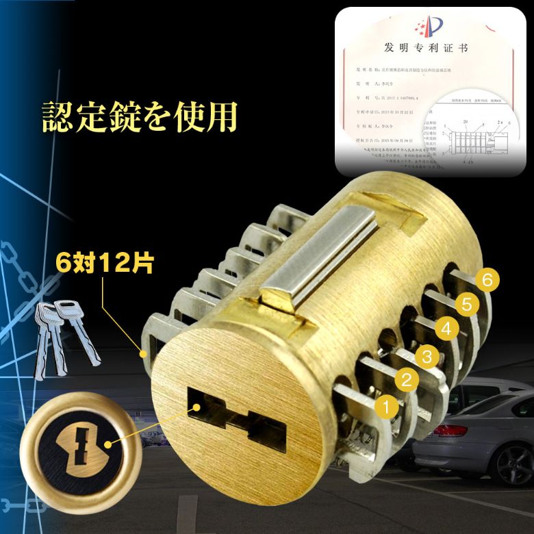 中国公安部Bクラス+認定錠を使用。シリンダーには6×2枚のピンを採用し、鍵挿入部は破壊防止にステンレスでカバーをしている。キーには複製されにくいデザインの特殊な凹みをしていて、標準で3本付属している。