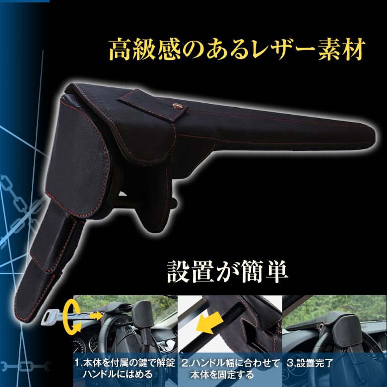 ハンドルロック全体に高級感のあるレザーを使用している。材質はどんな車にも合い、設置する際愛車に傷を付けない。