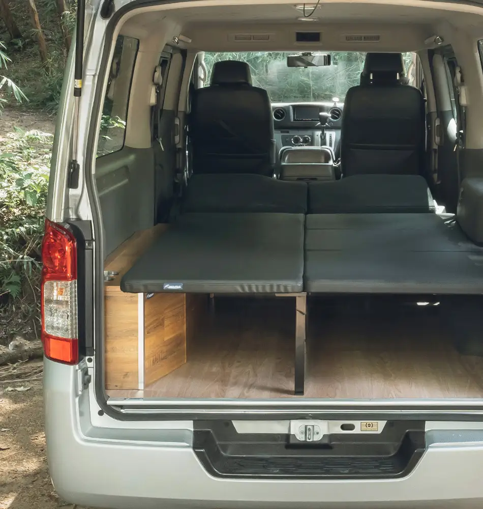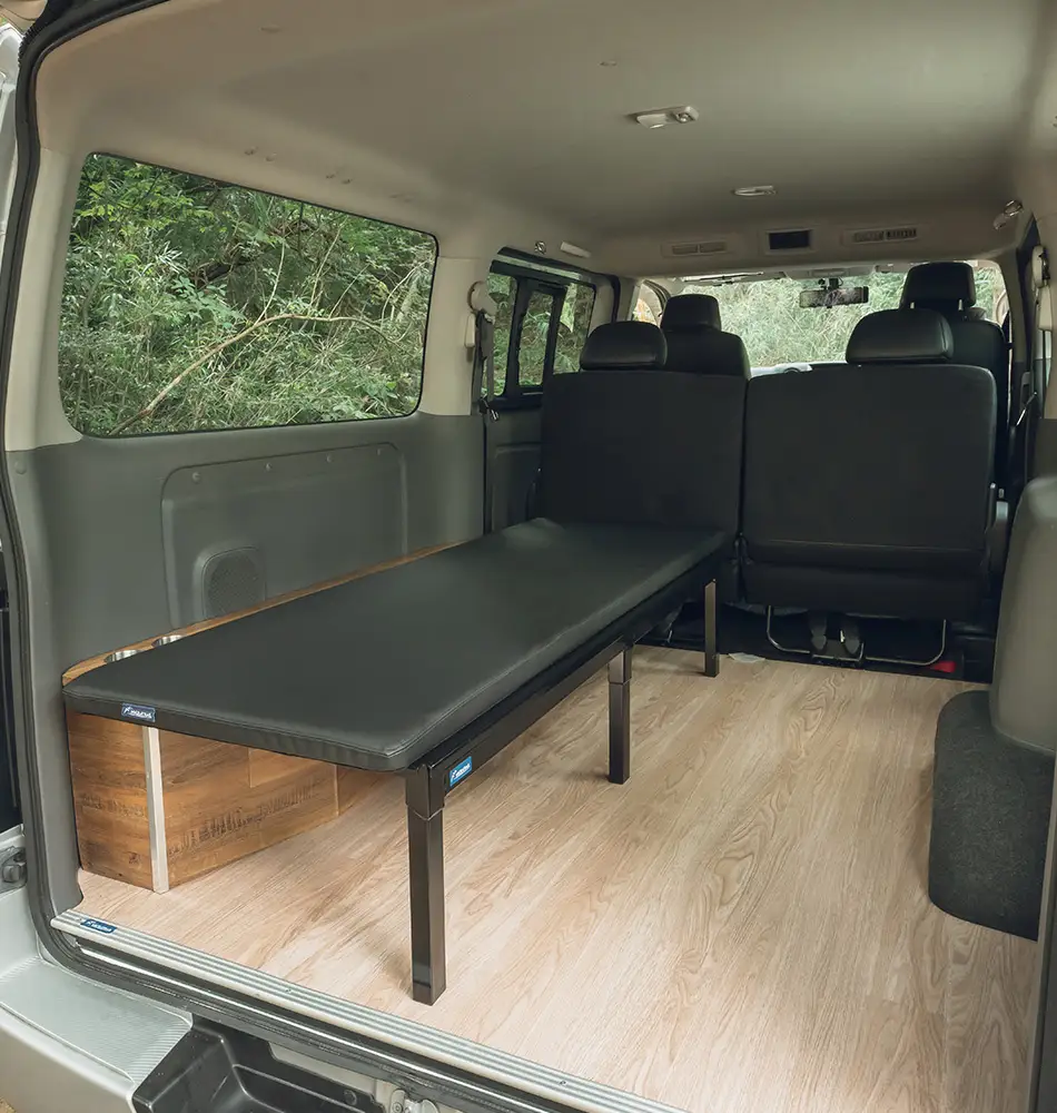 旅に思いを馳せ、とどまる事無く追求した空間利用。 別売りのサイドボックスキットに取付けて使用するフリップベッドキットは、 標準サイズ(4ナンバーサイズ)のバンに装着可能。 必要な時にこそ、シンプルにいきたい、そんな思いに応えるシンプルさ。 ベッドとして使用しない時や、大きな荷物を積載する際には簡単に折畳が可能。 厚み2cmのクッションを採用し、横になった時の身動きのとりやすさを意識。 旅を車両を知ってるからこそ、収納時の機能性にすら拘る。 折畳時に無駄なスペースを生み出さないクラフトマンによるオリジナル設計。