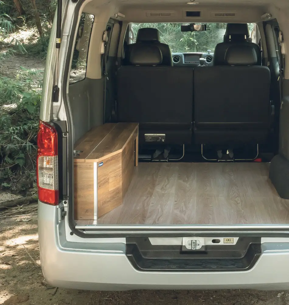 フロアパネルの有無に関わらず、サイドボックスを車両左側面に固定するオリジナル設計。 細々とした大事な道具達に、傘やアクティビティ時に備えておきたいフロアホンプなどの長尺アイテムなど、 大小様々なアイテムを収納出来る。 ワンボックス車でおきがちな、広いラゲッジスペースで走行中に荷物が動いて散乱してしまうアクシデントを回避。 旅先でのライド、そんな充実した時間を生み出せるよう考慮されたデザイン。 フリップベッド(別売り / 品番:MT60-0101)を取付るベースにもなり、旅の深度を深める。