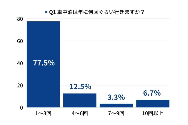 調査によると、約8割のドライバーが年に1~3回のペースで車中泊を行っていると回答したほか、多くの人が1人~2人で車中泊を行っていた。