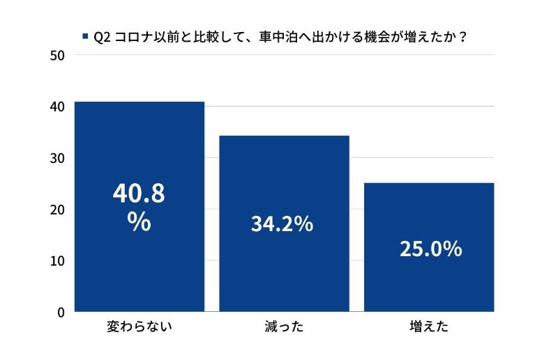 続いて「コロナ以前と比較して、車中泊へ出かける機会が増えたか」という質問である。さまざまなメディアやニュースを通して、これまでのアウトドアブームでは増えているという印象があったが、今回の結果は「変わらない」(40.8%)で1位。2位は「減った」(34.2%)。