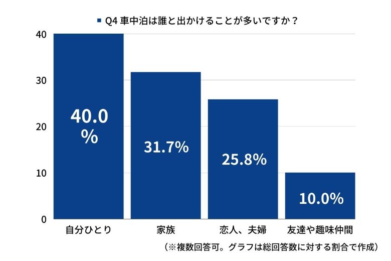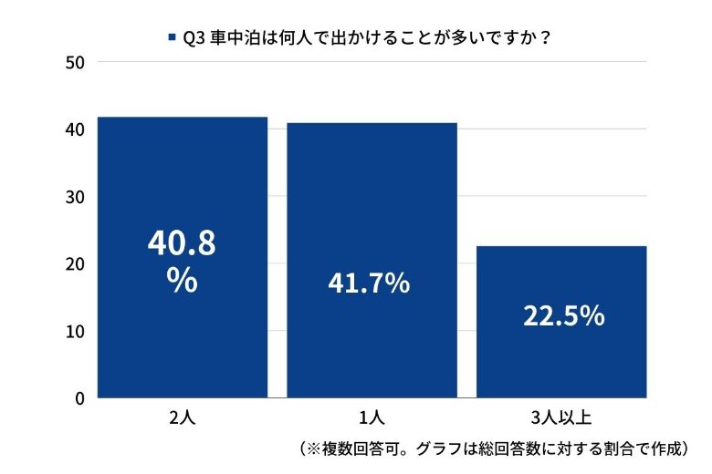 車中泊は「1人」(40.8%)、「2人」(41.7%)で、少人数が主流派