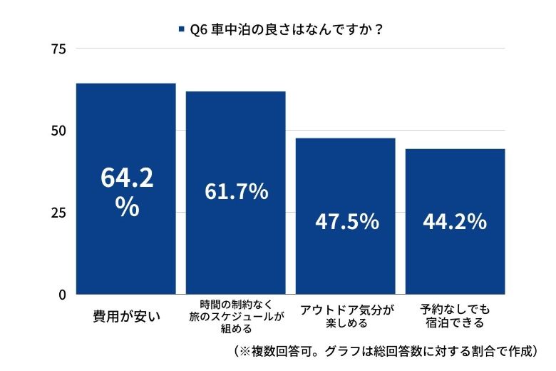 「車中泊の良さ」という質問では、やはり「費用が安い」が64.2%で1位だった。2位以下は「時間の制約がなく、旅のスケジュールが組める」(61.7%)、「アウトドア気分が楽しめる」(47.5%)、「予約なしでも宿泊できる」(44.2%)と続く。