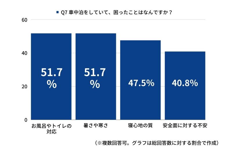一方、「車中泊で困ったこと」という質問では、トップ3は以下のとおり。1位が同率で「お風呂やトイレなどの対応」と「暑さや寒さ」(51.7%)、3位が「寝心地の質」(47.5%)。