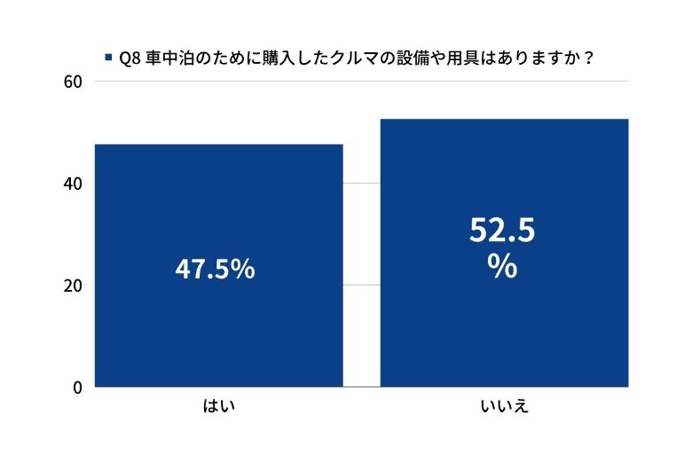 「車中泊のために購入したものがあるか」という質問に、約半数(47.5%)の人が「はい」と答えた。