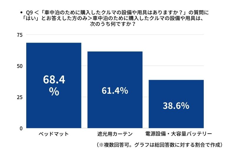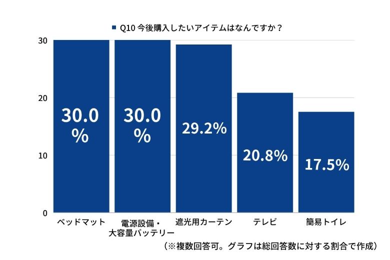さらに「今後購入したいアイテム」を尋ねると、「ベッドマット」(30.0%)と「電源設備・大容量バッテリー」(30.0%)が同率トップ。3位が僅差で「遮光用カーテン」(29.2%)。4位以下は「テレビ」(20.8%)、「簡易トイレ」(17.5%)と続いた。ちなみに「ない」と答えた人は27.5%もいた。