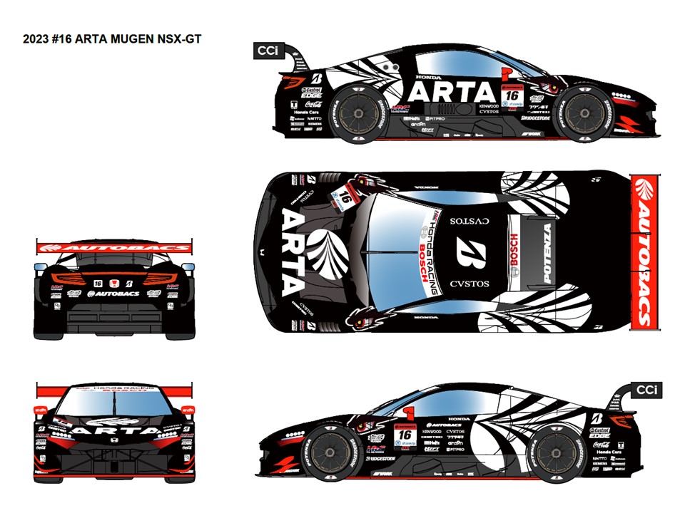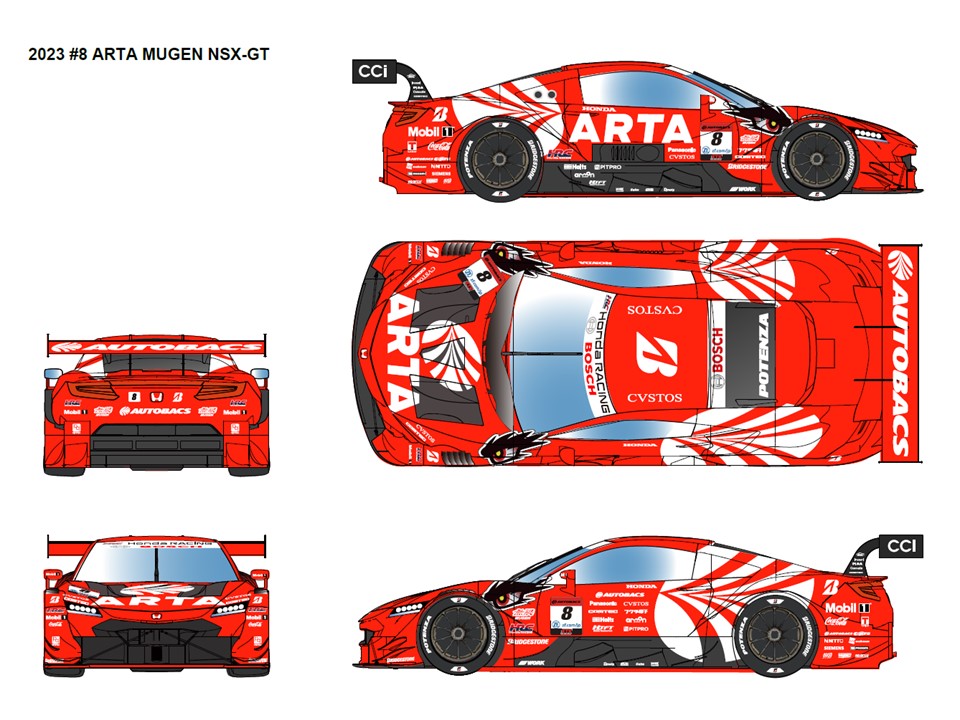 株式会社オートバックスセブンは、RACING SPORTS BRAND「ARTA」の2023年シーズンマシンデザインを発表した。無限のシンボルである「眼力」をフロントフェンダーに、巨大な「翼」に見立てたオートバックスロゴをリアフェンダーにあしらい、ラストイヤーを迎える「HONDA NSX-GT」の美しいフォルムを最大限際立たせるミニマムデザインとなっている。